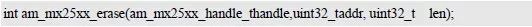 其中,handle 为MX25L1606 的实例句柄,addr 为待擦除区域的首地址,由于擦除的最小单元为扇区,因此该地址必须为某扇区的起始地址0x000000(0)、0x001000(4096)、0x002000(2×4096)……同时,擦除长度必须为扇区大小的整数倍。