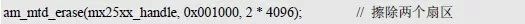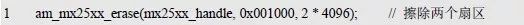 如果返回AM_OK,说明擦除成功,反之失败。假定从0x001000 地址开始,连续擦除2个扇区,范例程序详见程序清单6.25。