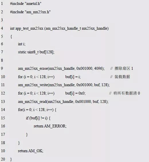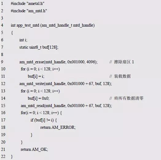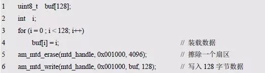 如果返回AM_OK,说明写入数据成功,反之失败。假定从0x001000 地址开始,连续写入128 字节数据的范例程序详见程序清单6.26。