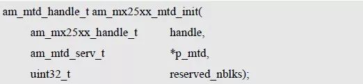 其中,MX25L1606 实例句柄(mx25xx_handle)作为实参传递给handle,p_mtd 为指向am_mtd_serv_t 类型实例的指针,reserved_nblks 作为实例信息,表明保留的块数。