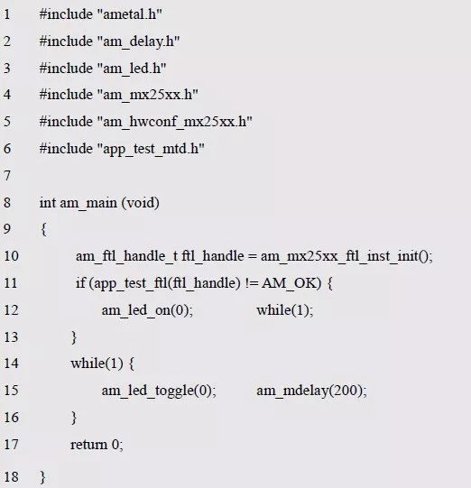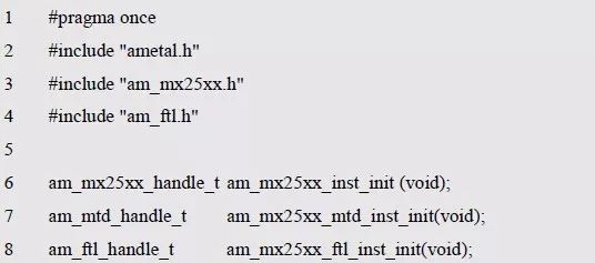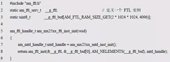 am_mx25xx_ftl_inst_init()无任何参数,与其相关实例和实例信息的定义均在文件内部完成,因此直接调用该函数即可获得FTL 句柄。即: