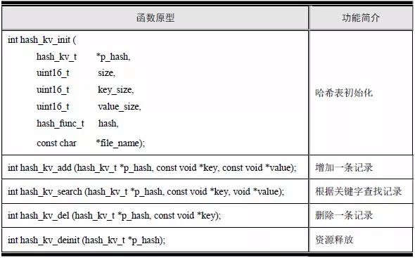 显然,除命名空间由 hash_db_*修改为了hash_kv_*(为了与之前的程序进行区分)外,仅仅是初始化函数中,多了一个文件名参数,即内部不再使用malloc 分配空间存储记录信息,而是使用该文件名指定的文件存储相关信息。如此一来记录存储在文件中,信息不会因掉电或程序终止而丢失。其中,hash_kv_t 为数据库结构体类型,使用数据库前,应使用该类型定义一个数据库实例,比如,“hash_kv_t hash;”。