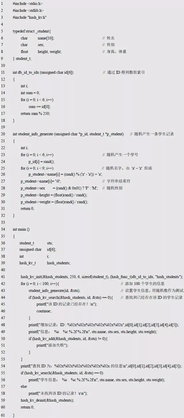 由于哈希表所使用的链表头数组空间、关键字和记录值等都存储在malloc 分配的动态空间中,这些信息在程序结束或系统掉电后都会丢失。在实际的应用中,往往希望将信息存储在非易失存储器中。典型的应用是将信息存储在文件中,从本质上来看,只要掌握了哈希表的原理,无论信息存储在什么地方,操作的方式都是一样的。