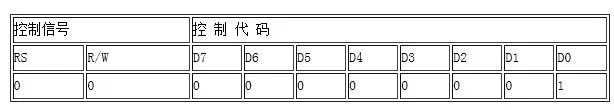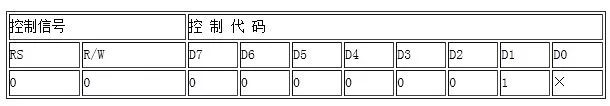 指令代码为01H,将DDRAM数据全部填入“空白”的ASCII代码20H,执行此指令将清除显示器的内容,同时光标移到左上角。