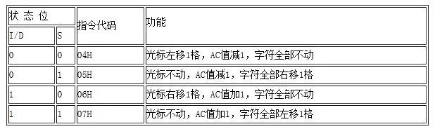 该指令用来设置光标、字符移动的方式。具体情况如下表所示。