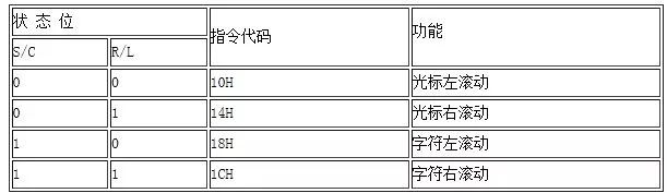 执行该指令将产生字符或光标向左或向右滚动一个字符位。如果定时间隔地执行该 指令,将产生字符或光标的平滑滚动。 具体情况如下表所示。