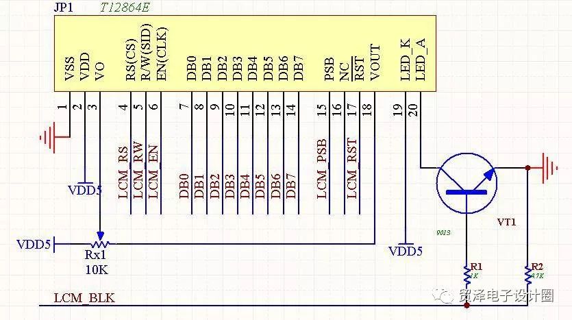 本电路是常见的12864电路,价格便宜,带中文字库。可以通过PSB端口的电平来设置其工作在串口模式还是并行模式,带背光控制功能。