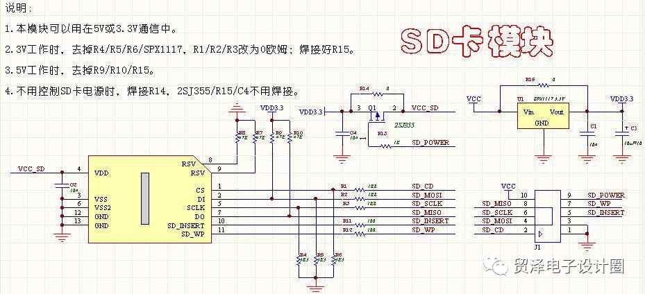 本电路与SD卡的封装有关,注意与封装对应。此电路可以通过端口控制SD卡的电源,比较完善,可以用于5V和3.3V。但是要注意,有些器件的使用,5V和3.3是不一样的。
