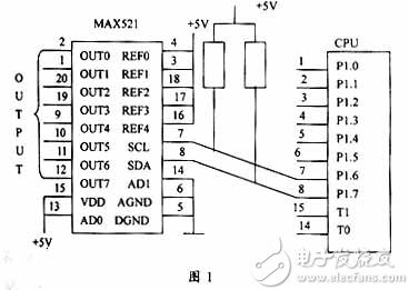 如图1所示,MAX521与单片机的P1.6、P1.7相连,并把它作为I2C总线来操作。所有参考电压均接+5V,使输出的模拟电压值在0~+5V之间。设备地址设为01B。OUTPUT后接执行设备。