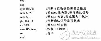 在每传送完一个地址字节或一个数据字节之后的第九个时钟脉冲期间,接收方在SDA线上产生一个低电平的应答信号ACK,以通知发送方数据已接收到,可以继续发送。所有数据传送完毕后,单片机向SDA线发送一个停止信号,结束该次数据传送。