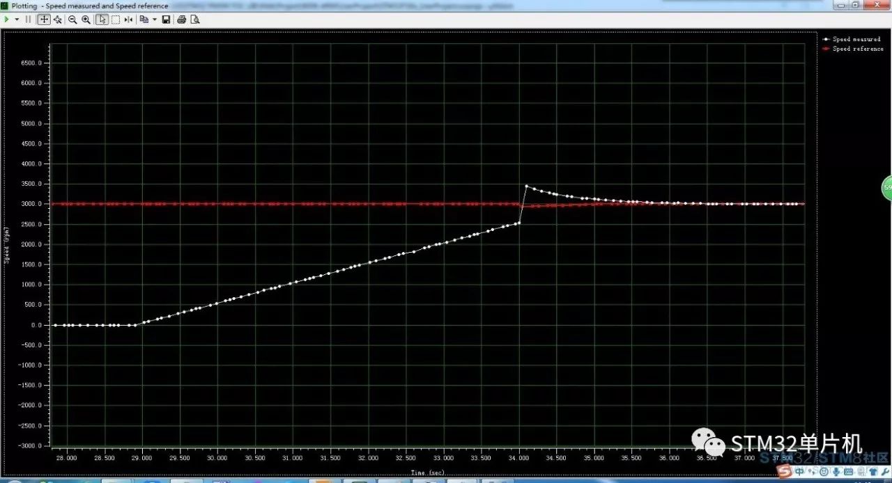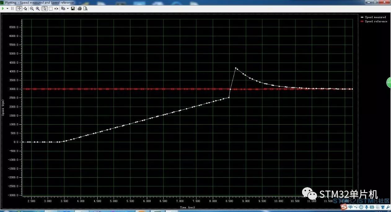 写入代码后,首先看一下原始PID参数的速度曲线,图中可以看出转速的超调比较大,已经达到4000多转