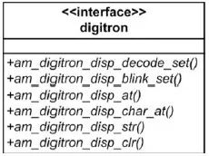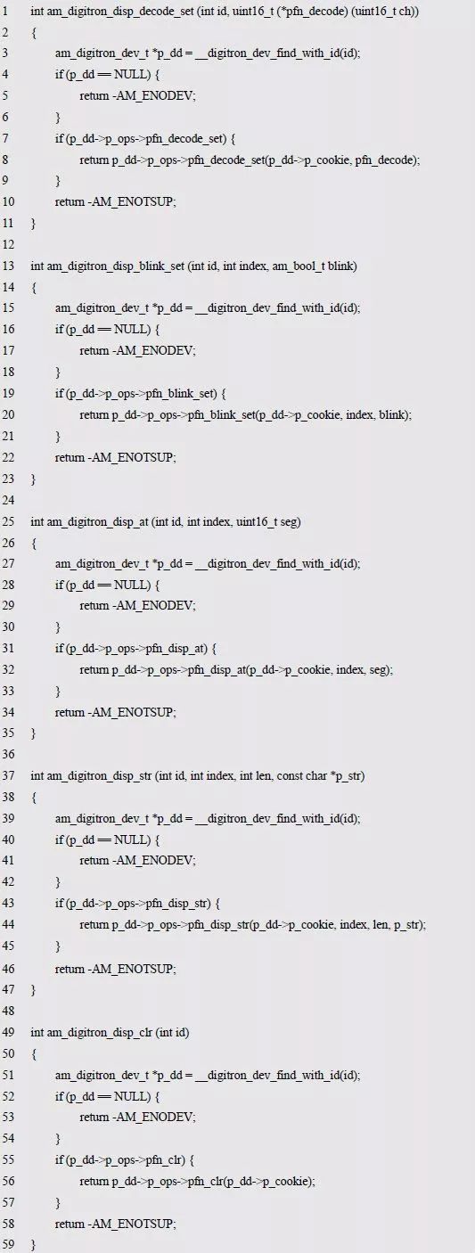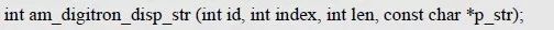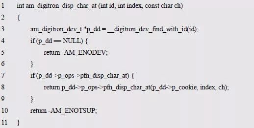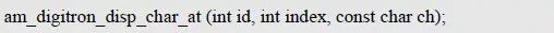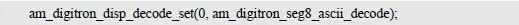 由于操作的对象是数码管(digitron),因此接口命名以“am_digitron_”作为前缀。数码管最常见的操作是设置数码管的显示内容,提供一个显示字符和字符串的接口,其对应的接口名为: