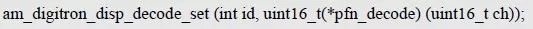 对于am_digitron_disp_decode_set()接口,其用于设定字符的解码函数,显然,一个数码管设备中的多个数码管往往是相同的,可以使用同样的解码规则,共用一个解码函数。因而接口仅需使用ID 指定数码管设备,无需使用index 指定具体的数码管索引。解码函数的作用是对字符进行解码,输入一个字符,输出该字符对应的编码。基于此,定义该接口的函数原型为(暂未定义返回值类型):
