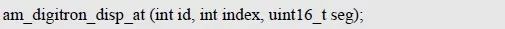对于am_digitron_disp_at()接口,其用于直接设置显示的段码,和显示一个字符类似,除数码管设备ID 外,同样需要使用参数指定显示的位置以及要显示的内容(段码),可定义该接口的原型为(暂未定义返回值类型):
