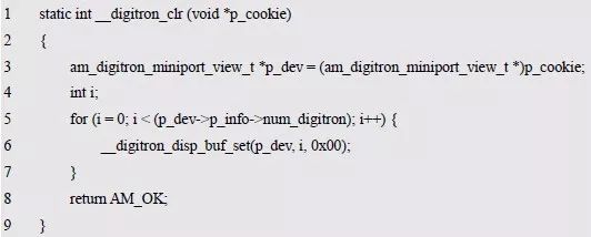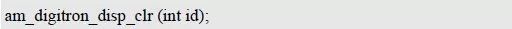 对于am_digitron_disp_clr()接口,其用于清除一个数码管设备显示的所有内容,仅需使用ID 指定需要清除的数码管设备,无需其它额外参数。定义该接口的原型为(暂未定义返回值类型):