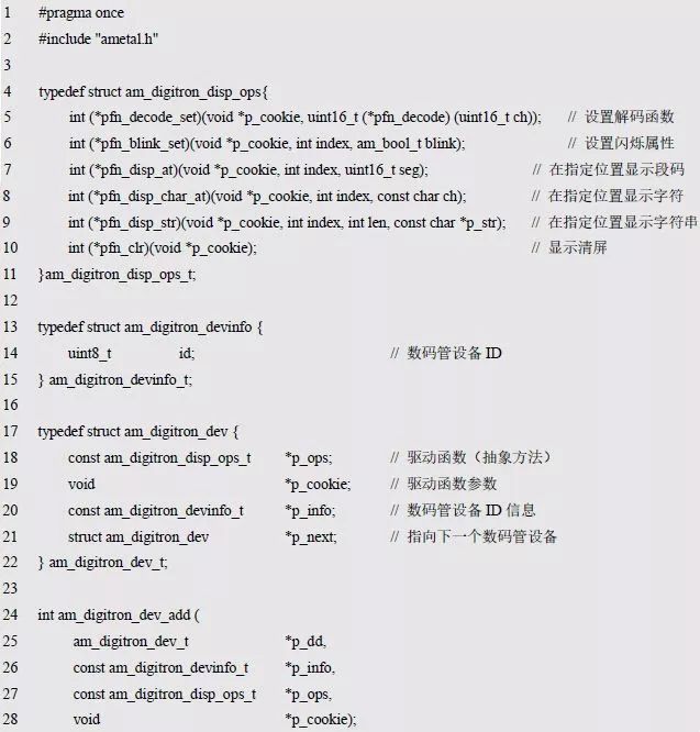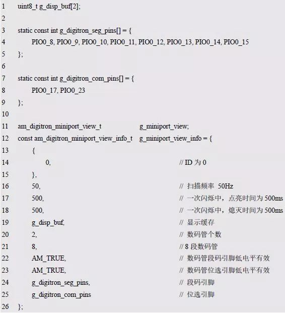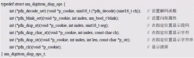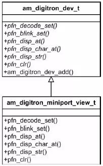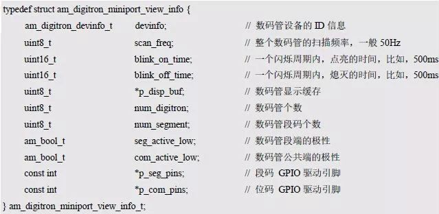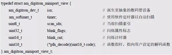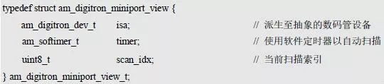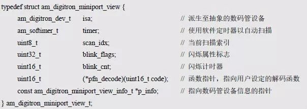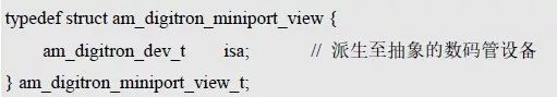 am_digitron_miniport_view_t 即为具体的数码管设备类。具有该类型后,即可使用该类型定义一个具体的数码管设备实例,即: