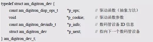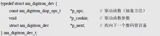 和LED 抽象设备类似,实际上可能存在多个数码管设备,由于它们的具体数目是无法预先确定的,因此这里使用单向链表进行动态管理,在am_digitron_dev_t 中增加一个p_next成员,用以指向下一个设备。即: