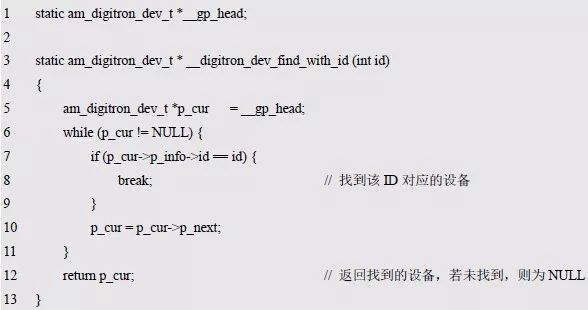 其中,__digitron_dev_find_with_id()的作用就是遍历设备链表,与各个设备中的ID 信息一一比对,以找到数码管ID 对应的数码管设备,其实现详见程序清单8.45。