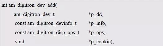 为了使通用接口能够操作到具体有效的数码管设备,就必须在使用通用数码管接口前,向系统中添加有效的数码管设备。根据数码管设备类型的定义,添加一个设备时,需要完成p_ops、p_cookie 和p_info 的正确赋值,这些成员的值是由具体数码管设备实现或定义的,为此,可以为具体数码管的设备驱动提供一个添加数码管设备的接口,定义其函数原型为: