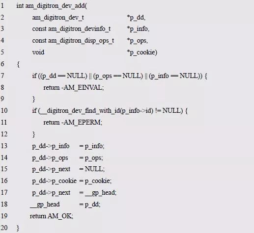 首先检查了各个参数的有效性,然后使用__digitron_dev_find_with_id()函数判断新设备的ID 号是否已经在系统中,若系统中已经存在该ID,则添加失败,直接返回操作不允许错误(-AM_EPERM)。若系统中不存在该ID,则继续执行,以确保添加的各个数码管设备的ID 不冲突,保证了数码管设备编号的唯一性,接着将设备中的各个成员赋值,最后通过程序清单8.47 的17~18 这2 行代码将新设备添加到链表首部。
