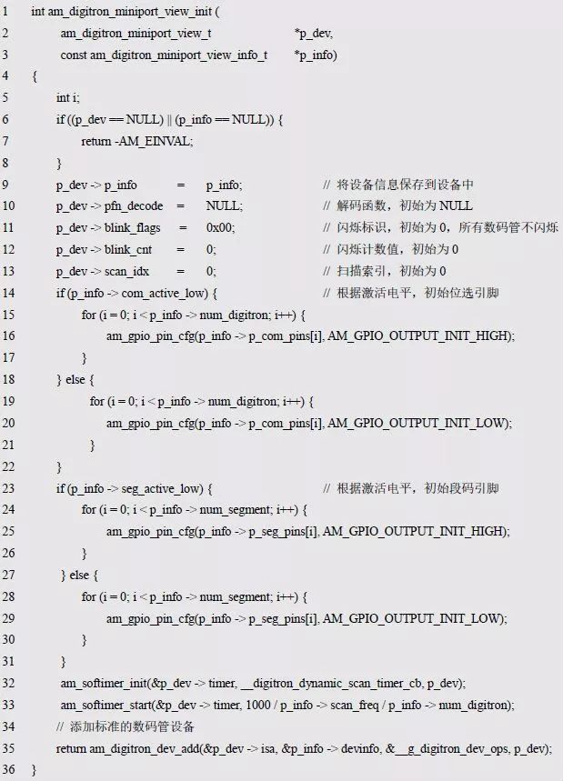 为了正常扫描数码管,需要完成设备中各成员的赋值,在完成初始赋值后,则可以启动软件定时器,进而以设备信息中指定的扫描频率自动扫描数码管。这些工作通常在驱动的初始化函数中完成,定义初始化函数的原型为: