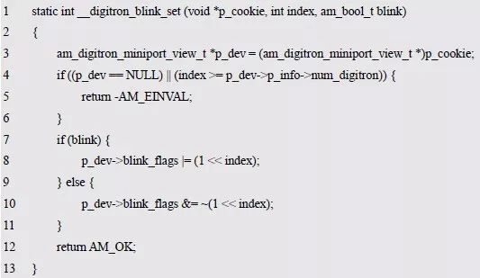 对于am_digitron_disp_blink_set()接口,其用于设置数码管的闪烁属性,除数码管设备ID 外,还需要使用参数指定设置闪烁属性的数码管位置以及使用本次设置的闪烁属性(打开闪烁还是关闭闪烁),定义该接口的原型为(暂未定义返回值类型):