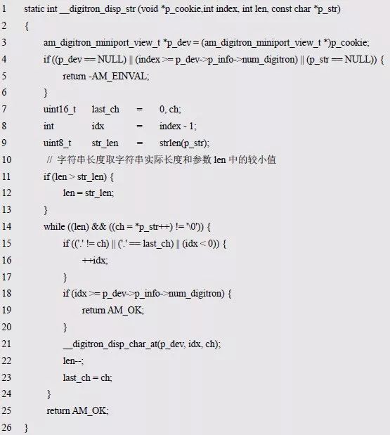 该程序首先确定了字符串的长度,字符串长度取字符串实际长度和参数len 中的较小值,然后再while 循环中,调用了__digitron_disp_char_at()函数依次显示单个字符。