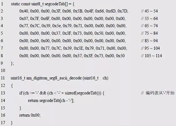 当用户使用初始化函数完成一个具体数码管设备的初始化后,即可使用通用数码管接口操作数码管,显示具体内容。但是,在显示字符或字符前,必须使用通用接口设置一个解码函数。对于8 段数码管,可以将各个ASCII 字符的段码定义在一个数组中,然后实现一个解码函数,详见程序清单8.61。