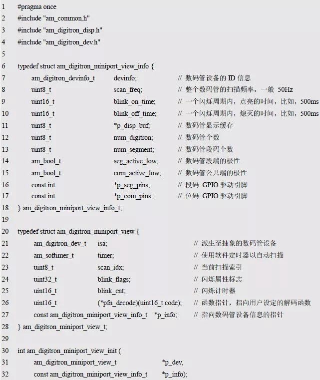 为了便于查阅,如程序清单8.62 所示展示了具体数码管设备(MiniPort_View)接口文件(am_digitron_miniport_view.h)的内容。