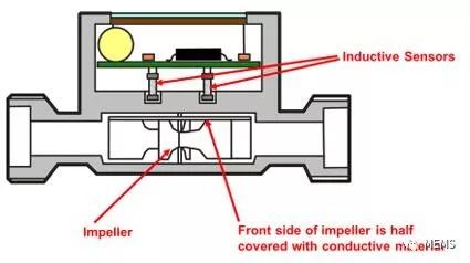 图1:住宅和工业应用中的流量计示例在大部分流量计的设计中,其活动部件都会使用机械感测。例如,使用电感电容器(LC)、巨磁电阻(GMR)、隧道式磁阻(TMR)或霍尔效应传感器捕获螺旋桨或叶轮的运动,该运动根据流量而变化,并被转换成数据并传递给测量单元。因为有活动部件,所以可能会出现磨损和不准确的情况。这些仪表的寿命普遍较短(不到7年),并且不能检测到低流量或小泄漏。同时,介质污染、污垢积聚以及部件的结垢和老化也会影响测量精度,很可能导致传感器结果不准确,因此还需要定期对流量计进行重新校准。图2所示为带有LC传感器的旋转式水表 。