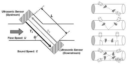 图2:使用LC传感器的旋转式流量计超声波传感避免了上述几个问题。该传感技术非常精确(<±1%),具有较长使用寿命(> 10年),可以方便地检测不同成分的液体或气体,并调整介质和管道腐蚀污染的影响。超声波仪表没有活动部件,因此无需重新校准。用于流量测量的超声波频率范围为100kHz至4MHz。使用一定频率的电脉冲信号激发超声波传感器从而产生相应频率的超声波,并使用同一声波传输路径从两个对立的方向在不同时段发射声波并测量声波传输时间(记为上行传输时间和下行传输时间,TOF,Time of flight)。通过计算上下行传输时间的绝对时间差,进而计算出实际流量。安装在流管内部或外部的一对或多对超声波传感器可以用来测量TOF。图3所示为简易的超声波测量原理和一些常见的超声波传感器布置扑。超声波传感器的选择取决于待测流体的介质类型。通常,待测流体为液体时使用频率大于等于1MHz的超声波传感器,待测流体为气体时使用频率小于等于500kHz的超声波传感器。