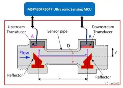 图4:MSP430FR6047和超声波换能器连接示意图一对超声波换能器可以直接与MSP430FR6047 MCU集成的超声波外设(USS)连接。USS使用高速8MSPS的Σ-Δ ADC可以灵活的对每个传感器进行独立的激励和响应捕获。USS再将捕获的波形采用多种数字信号处理算法进行下一步处理。MSP430FR6047 MCU中采用的波形捕获技术和处理方法能够得到一流的分辨率(<5ps) —— 对住宅和工业应用中的液体和气体流量检测是一个突破性系统设计。目前大多数超声波流量计都是电池供电的,然而基于MSP430FR6047 MCU的超声波流量表解决方案的平均耗电量仅为3 μA,从而能够达到10多年的使用寿命。此外,您可以轻松地将此方案扩展到热量计。用于流量测量的超声波传感集成了以下优势:尺寸更小、成本更低、精度和稳定性提高、延长产品寿命、可与智能电网连接等。