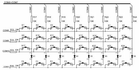 如图6.13 所示为按键电路,ZLG72128 能够管理多达32 个按键(4 行8 列),行线分别连接COM8 ~ COM11 引脚,列线分别连接COM0 ~ COM7。特别地,前3 行按键(共计24个按键)是普通按键,按键按下时会通过INT 引脚通知用户,按键释放时不做任何通知。最后一行按键(共计8 个按键)是功能键,其以一个8 位数据表示8 个键值的状态,F0 ~ F7分别对应bit0 ~ bit 7。按下时相应位为0,释放时相应位为1,只要表示这8 个按键的8 位数据值发生变化,则会通过INT 引脚通知用户,因此对于功能按键,按键按下或释放用户均能够得到通知。