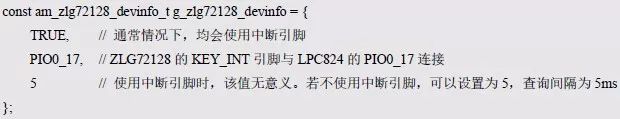 一般地,只要主控器的I/O 资源不是非常紧缺,均会使用中断引脚。若为节省一个I/O中断资源,可将use_int_pin 设置为FALSE,此时将不占用IO 中断资源,而系统将会以查询的方式从ZLG72128 中获取键值,这就会耗费一定的CPU 资源,因为每隔一段时间就要主动查询一次键值。假设使用ZLG72128 的中断引脚,主控制器使用LPC824,ZLG72128 的KEY_INT 引脚与LPC824 的PIO0_17 连接。其实例信息定义如下: