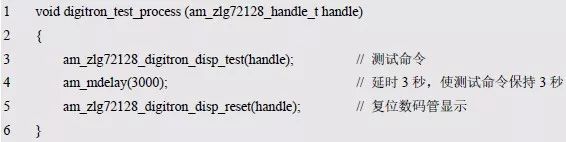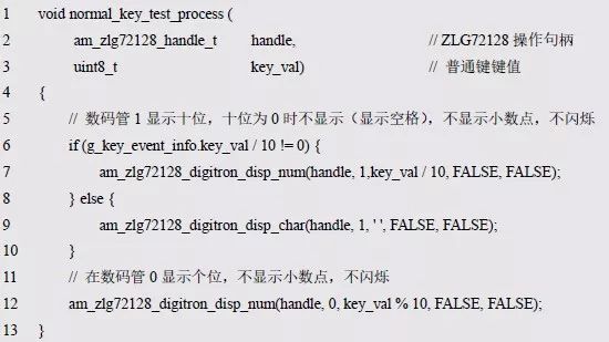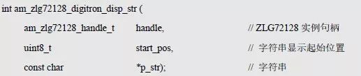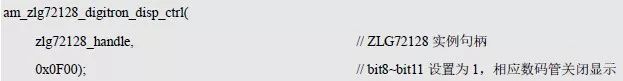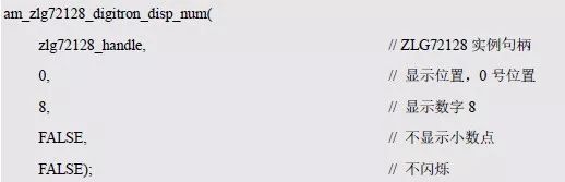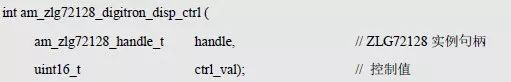 am_zlg72128_init()函数的返回值为ZLG72128 实例的句柄,该句柄将作为其它功能接口(数码管显示、按键管理等)的第一个参数(handle)的实参。
