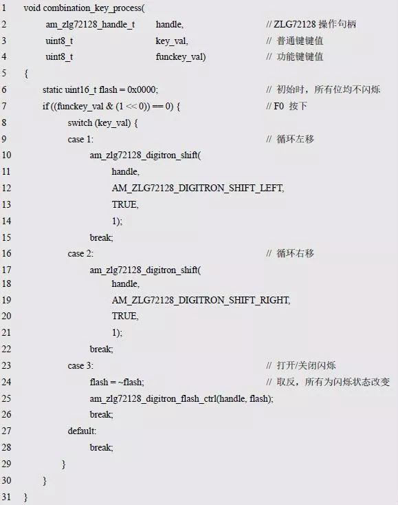 功能键类似PC 机上的Ctrl、Alt、Shift 等按键,使用普通键和功能键很容易实现组合键应用,注册按键回调函数的范例程序详见程序清单6.113。