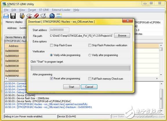在这里,使用带有STM32F091RCT6 的NUCLEO-F091RC 板来进行问题还原,将此Nucleo 板通过USB 线连接到电脑。打开STM32 ST-LINK Utility,点击“Connect to the target”按钮进行芯片连接,连接后打开一个准备好的LED 灯闪烁的.hex 文件代码,点击“Program verify”按钮准备进行编程。