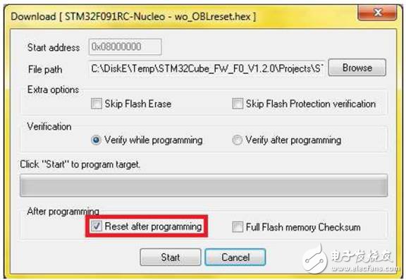 iii. 再打开需要烧写的代码文件,点击“Program Verify”按钮,对话框中勾选“Reset after programming”,点击“Start”完成烧写动作就可以了。