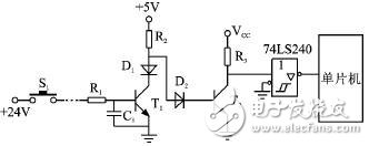 若考虑到由于TTL电平电压较低,在长线传输中容易受到外界干扰,可以将输入信号提高到+24 V,在单片机入口处将高电压信号转换成TTL信号。这种高电压传送方式不仅提高了耐噪声能力,而且使开关的触点接触良好,运行可靠,如图2所示。其 中,D1为保护二极管,反向电压≥50 V。