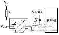 此外,一种常用的输入方式是采用光耦隔离电路。如图4所示,R为输入限流电阻,使光耦中的发光二极管电流限制在10~20 mA。输入端靠光信号耦合,在电气上做到了完全隔离。同时,发光二极管的正向阻抗值较低,而外界干扰源的内阻一般较高,根据分压原理,干扰源能馈送到输入 端的干扰噪声很小,不会产生地线干扰或其他串扰,增强了电路的抗干扰能力。