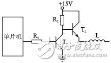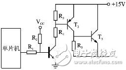 T1截止、T2导通期间,为了对T2提供足够的基极电流,R2的阻值必须很小。因为T2处于射极跟随器方式工作,因此为了减少T2损耗,必 须将集射间电压降控制在较小范围内。这样集基间电压也很小,电阻R2阻值很小才能提供足够的基极电流。R2阻值过大,会大幅度增加T2压降,引起T2发热 严重。而在T2截止期间,T1必须导通,高压+15 V全部降在电阻R2上,产生很大的电流,显然是不合理的。另外,T1的导通将使单片机高电平输出被拉低至接近地电位,引起输出端不稳定。T2基极被T1拉 到地电位,若其后接的是感性负载,由于绕组反电势的作用,T2的发射极可能存在高电平,容易引起T2管基射结反向击穿。