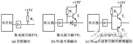 为了改善开关速度,可采用2种改进形式输出电路,如图7(b)和图7(c)所示。图7(b)是能快速开通的改进电路,当TTL输出高电平 时,输出点通过晶体管T1获得电压和电流,充电能力提高,从而加快开通速度,同时也降低了集电极开路TTL器件上的功耗。图7(c)为推挽式的改进电路, 采用这种电路不但可提高开通时的速度,而且也可提高关断时的速度。输出晶体管T1是作为射极跟随器工作的,不会出现饱和,因而不影响输出开关频率。