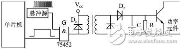 这种电路必须有一个脉冲源,脉冲源的频率是载波频率,应至少比单片机输出频率高10倍以上。脉冲源的输出脉冲送入控制门G,单片机输出信号 由另一端输入G门。当单片机输出高电平时,G门打开,输出脉冲进入变压器,变压器的副线圈输出与原边相同频率的脉冲,通过二极管D1、D2检波后经滤波还 原成开关信号,送入功率管。当单片机输出低电平时,G门关闭,脉冲源不能通过G门进入变压器,变压器无输出。