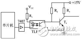 光电耦合可以传输线性信号,也可以传输开关信号,在输出级应用时主要用来传递开关信号。如图9所示,单片机输出控制信号经缓冲器7407放 大后送入光耦。R2为光耦输出晶体管的负载电阻,它的选取应保证: 在光耦导通时,其输出晶体管可靠饱和;而在光耦截止时,T1可靠饱和。但由于光耦响应速度慢使开关延迟时间加长,限制了其使用频率。