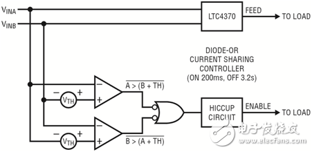 这里介绍的解决方案检测输入电压差,并在检测到设定的电源电压之差时,停用下游负载。这个电压差设定为低于 LTC4370 的最大电压门限。如果检测到失衡情况,那么下游电源就被停用。为了防止发生震荡情况,电路进入打嗝模式,电源每隔 3.2 秒周期性接通 200ms。方框图如图 1 所示。