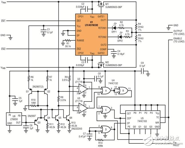 在正常运行时,LTC4370 允许电压较高的电源提供全部负载电流,但是在另一个电源不能提供全部电流的情况下,必须防止这样运行。本文介绍了在这种情况发生时,一种停用下游负载的解决方案。