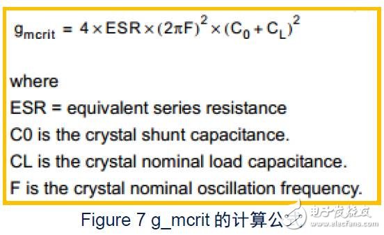 其中gm就是图4中从数据手册中提到的跨导值,STM32F030 LSE的不同驱动等级对应着不同的gm值,由于我们的测试代码使用的是CubeMx自动生成的代码,其默认使用的是最高等级,且客户使用的也是最高等级,因此,这个得出的gm值为25 uA/V, gm有了,那么上面公式中的gmcrit又该如何计算,我们接下来找到它的计算公式,如:
