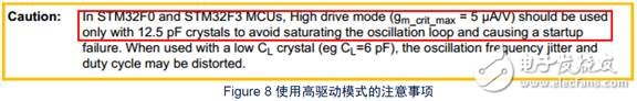 也就是说,在STM32F0和STM32F3中,当使用最高驱动模式(gm_crit_max=5uA/V, 见Figure9gm_crit_max)时,对应地应该只使用在CL=12.5pF的晶振上,以此避免振荡回路饱和,从而导致启动失败。若此时使用了一个较小的CL(如CL=6pF),那么会导致振荡频率不稳定和工作周期可能被扭曲。