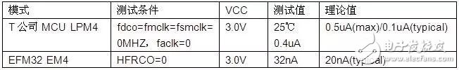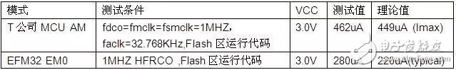 测试条件:室温条件下,使用同一电流计及测量负载。T公司MCU分为6种运行模式,其中5种低功耗模式,AM(运行模式)、LPM0~LPM4;EFM32分为5种运行模式,其中4种低功耗模式,EM0(运行模式)、EM1~EM4。