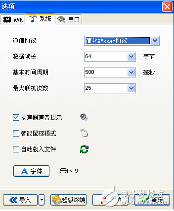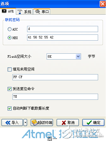 2) 设置 AVRUBD 。 点击“选项”,点击下拉菜单的AVR, 先将“ AVR ” 选项卡下的参数设置为图 一 的要求, 注意 flash 空间大小是8K (这个根据具体mcu设置,如xmage16,应设置为16K); 联机密码为HEX:41 56 52 55 42;然后选“系统” 卡片, 设成图二 所示, 注意通讯协议要选简化 Xmodem 协议;数据帧长度为:64,(根据mcu串口接收buff设置,如xmage16应设置为256); 再选“串口 ” 卡片, 将其设成图三 所示, 其中串口号要根据你所用电脑实际串口确定;波特率为38400; 完成以上设置后点击“确定”